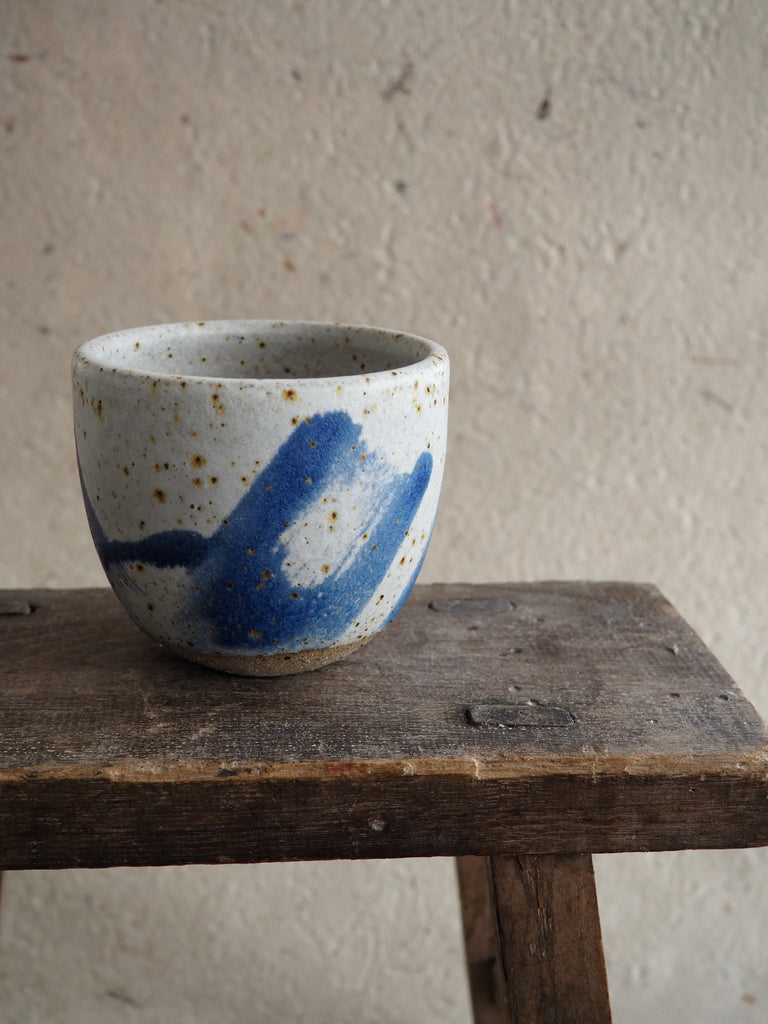 It has been glazed in matte white and decorated with playful cobalt brushstrokes. The iron speckles in the clay can be seen too.