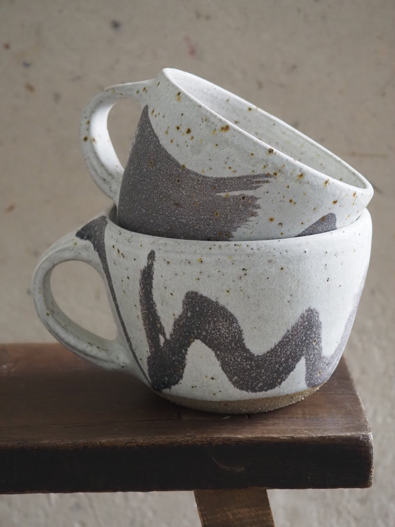 This large cup was thrown on my potter’s wheel using speckled stoneware clay and had been hand painted with a playful charcoal wiggly line. It is perfect for a big cup of tea or coffee.
