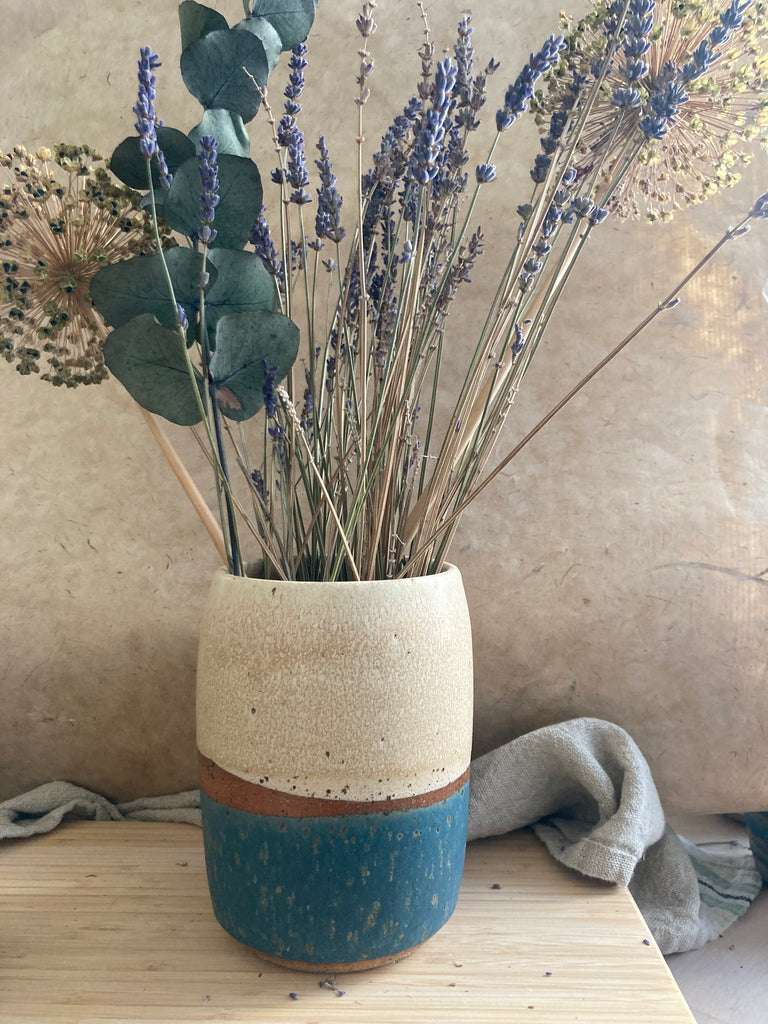 This large vase was thrown on my potters wheel in speckled stoneware clay and glazed by hand in matte cream and teal. It’s perfect for fresh and dried flowers and works in a modern and rustic setting.