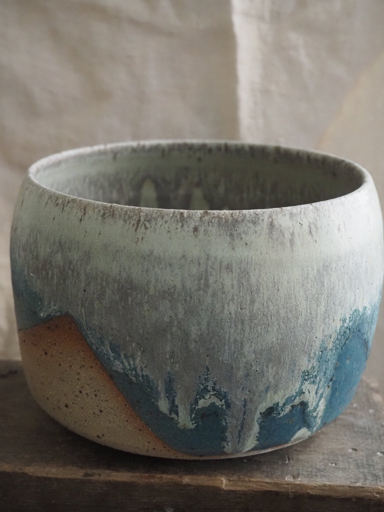 This large planter was thrown in speckled stoneware clay on my potter’s wheel. It has been glazed in cream and teal and there’s glaze magic where the two meet: reminiscent of beautiful sea spray.