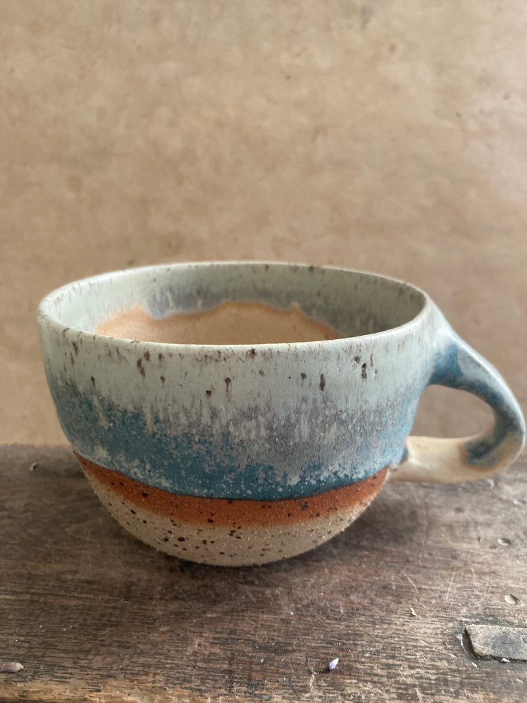 It’s been glazed in matte teal and cream and there is some glaze magic where the two meet.