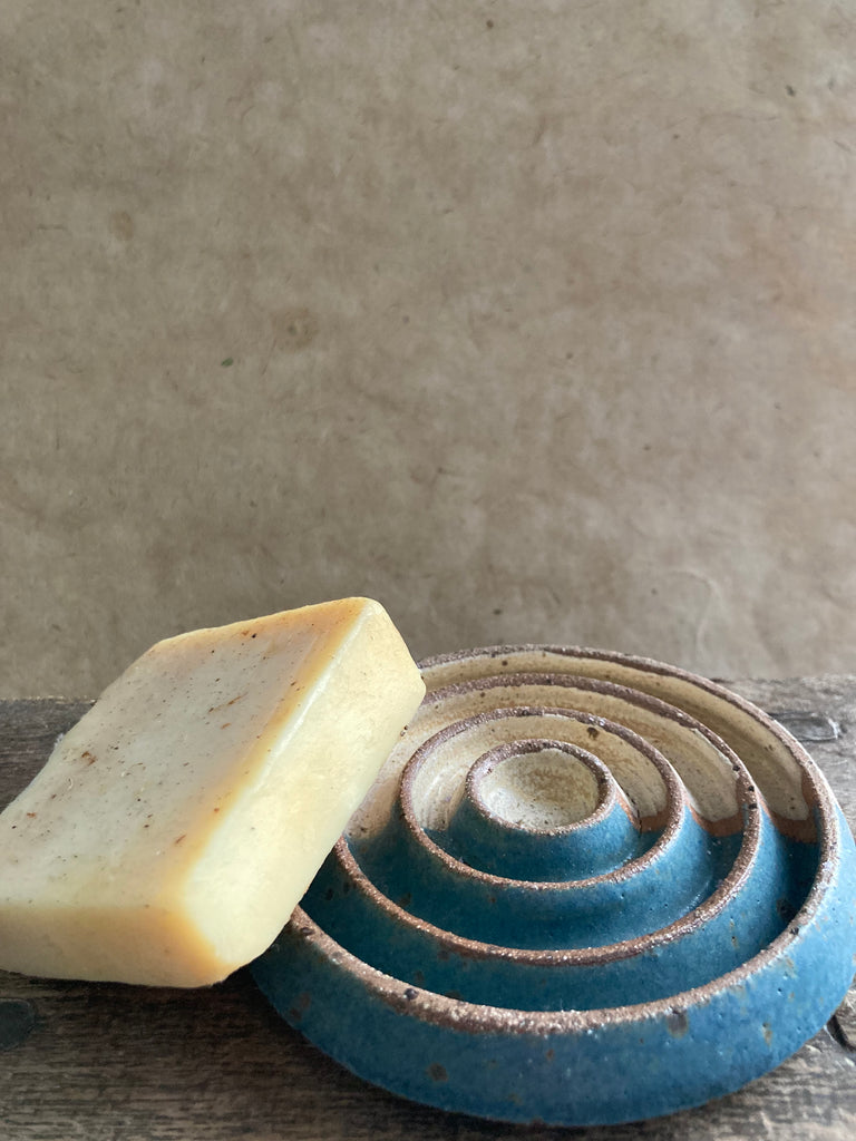 This soap dish was thrown on my potter’s wheel and has been glazed in matte matte cream and teal. The speckled stoneware clay is revealed through the glaze and in the stripe in the middle.